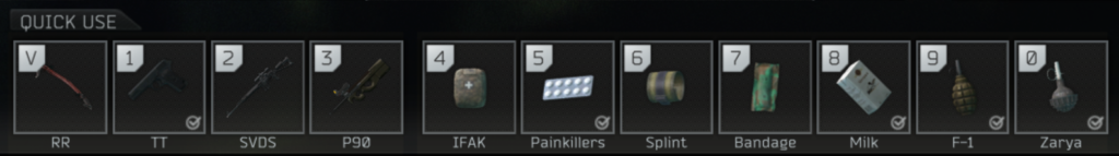 Do rýchlej predvoľby môžu byť pridané len veci, ktoré sa fyzicky nachádzajú v taktickej veste (tactical rig) na postave alebo vo vačkoch (pockets). Nabindovať sa dá, potiahnutím predmetu na zvolenú pozíciu alebo stlačením požadovanej číslice, ak sa myš nachádza na zvolenom predmete.