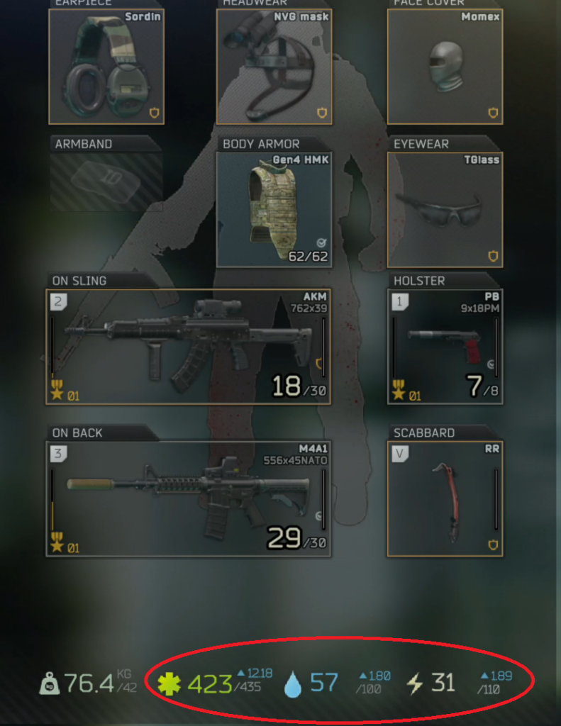 - Môžete postavu doliečiť pomocou lekárničiek v sklade, vodu/hydratáciu doplniť pomocou nápojov, energiu pomocou jedla. Táto možnosť je rýchlejšia ale musíte obetovať lekárničky, vodu, jedlo, ktoré stoja nejaké finančné prostriedky.