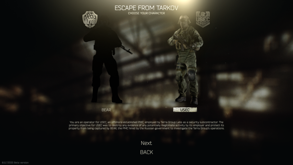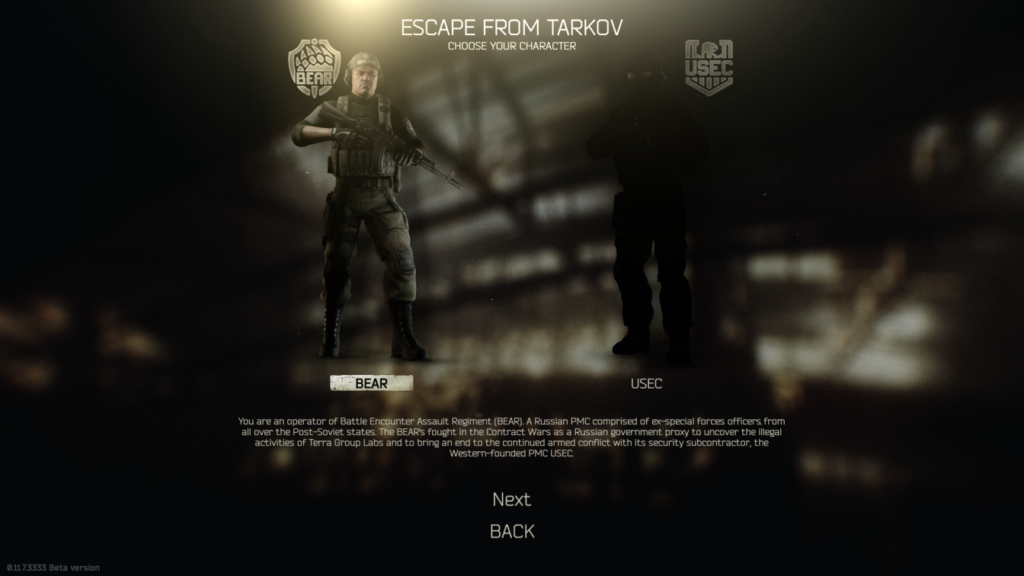 Teraz máte na výber, za ktorú hlavnú frakciu budete hrať – BEAR alebo USEC. Majú odlišné oblečenie, základne vybavenie. V EFT sa dajú používať hlasové príkazy – USEC rozpráva po anglicky, BEAR po rusky. (POZOR: Zmeniť frakciu môžete raz za 21 dni, ale len pomocou resetu účtu. Takže prídete o všetko / začínate úplne odznova.)