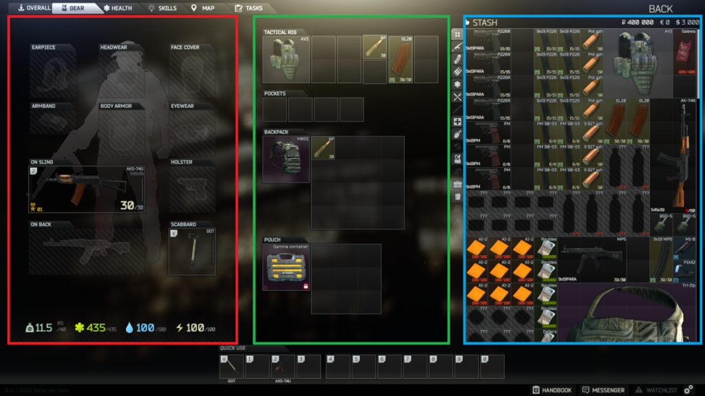 Na pravej strane (označené modrou) je váš sklad (stash). Veci v sklade neberiete do raidu , zostávajú v bezpečí. Do skladu si odkladáte veci, ktoré donesiete z raidu, dostanete za splnenie úlohy (questu)  alebo kúpite v obchode (market).